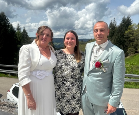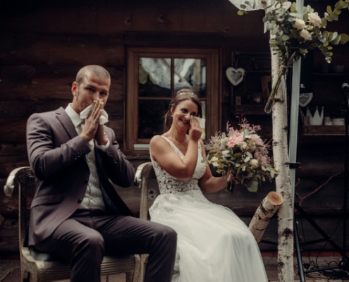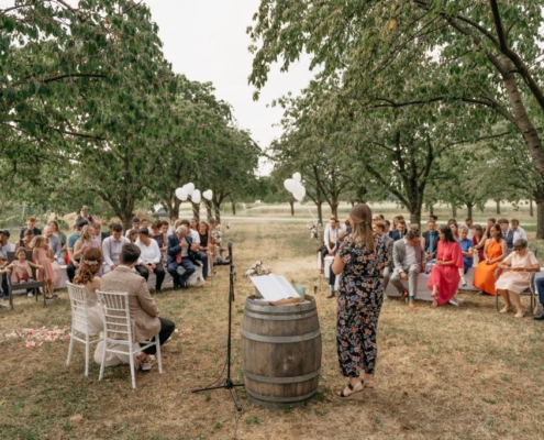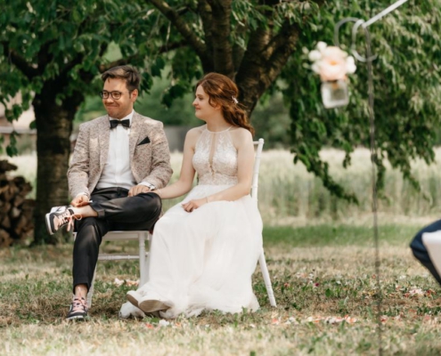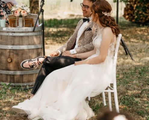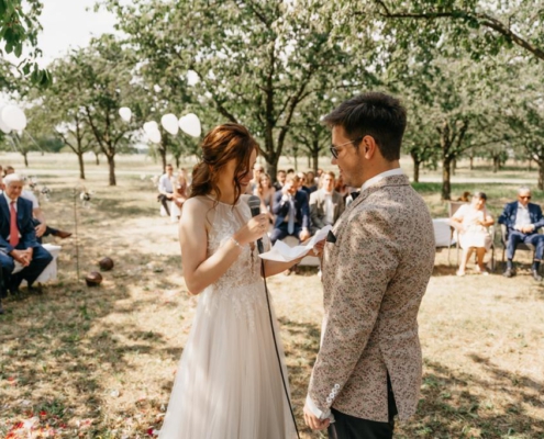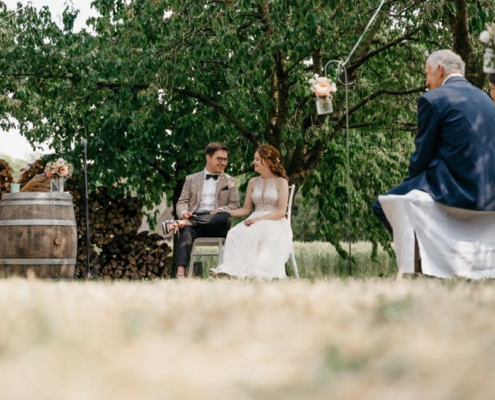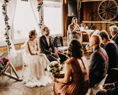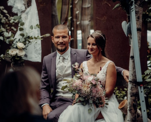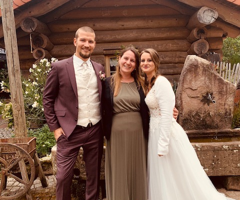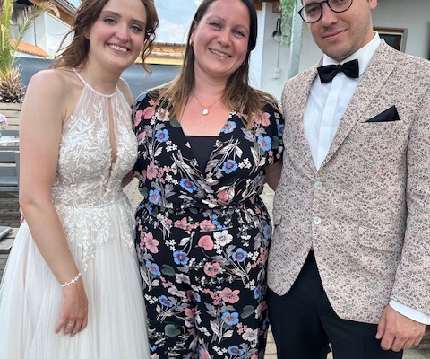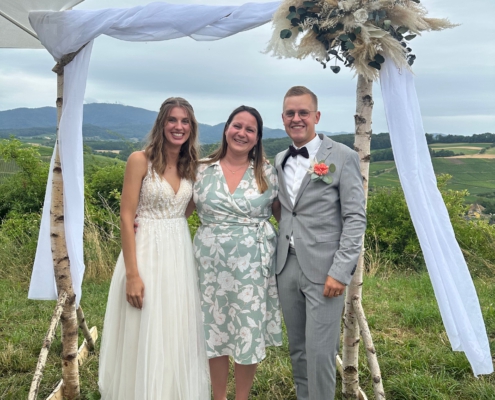 „Wir haben uns Mitte Oktober im Freien im schönen Bad Bellingen das Ja-Wort gegeben. Magdalena hat uns mit ihrer lockeren und herzlichen Art von Anfang an überzeugt. In unseren Vorgesprächen ganz nebenbei viele schöne Anekdoten unserer Beziehung entlockt, die sie in eine ganz individuelle wunderschöne und auch lustige Rede gepackt hat. Sie hat nicht nur uns sondern auch unsere Gäste miteingebunden und begeistert. Wir sind super froh, Magdalena als freie Rednerin für unsere Trauung engagiert zu haben – Danke, dass du dazu beigetragen hast, unseren besonderen Tag für uns einfach unvergesslich zu machen!“